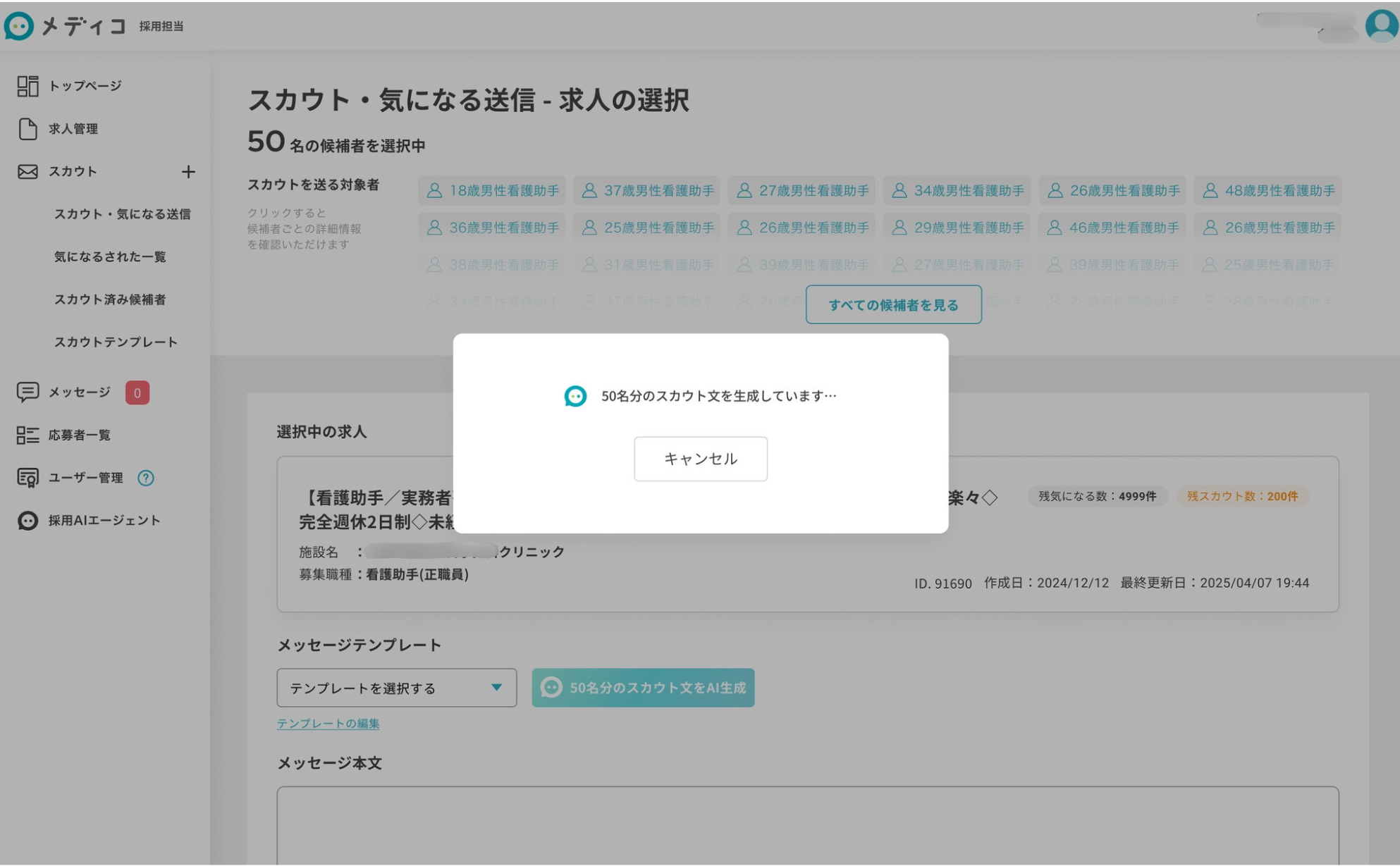 AI補助機能により、最大50名の候補者に対してスカウトをまとめて送信することが可能です。 候補者選定からメッセージ作成までをAIがサポートし、採用担当者の作業負担を軽減します。